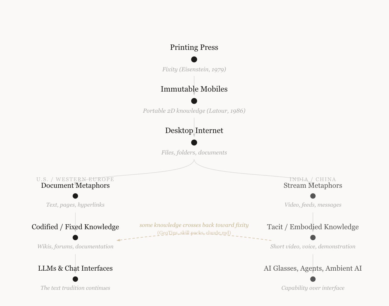 Both India and China are regions where most of the population skipped the desktop era of the web and went straight to mobile. The metaphors that shaped the desktop era were document metaphors (files, folders, texts), all of which map neatly onto the two-dimensional immutable plane of print that we were familiar with before. But for someone who first encounters the internet through a mobile phone, the metaphors they become familiar with are stream metaphors: videos, timelines, messages, feeds. They skipped the desktop metaphors entirely, and as a result, there is less attachment to fixed versions of knowledge and more affinity for tacit, embodied knowledge that flows through short videos, voice messages, and live demonstrations.