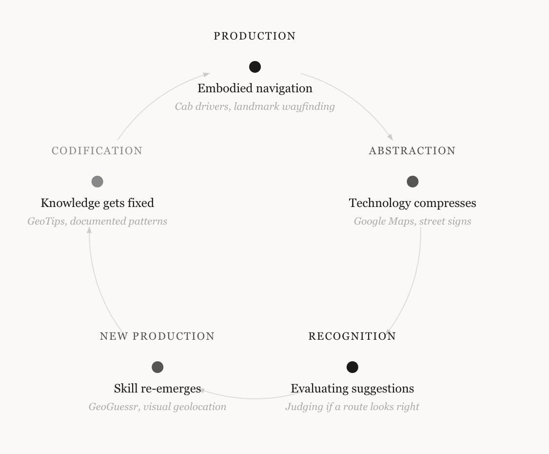 There is a widely cited study by Eleanor Maguire from the year 2000 that found London cab drivers had significantly larger posterior hippocampi (the brain region associated with spatial memory) than control subjects, and that the enlargement correlated with years spent on the job. These drivers had spent years acquiring what is known in London as “The Knowledge,” an intimate, embodied familiarity with over twenty-five thousand streets, built up through repeated traversal on mopeds and tested through grueling oral exams. With the ubiquitous adoption of maps software on phones, that skill has all but become obsolete. Now most people, even ones who have lived in a city for a long time, navigate through signs and symbols on Google Maps. The production skill, constructing a route in your head from accumulated experience, has been replaced by a recognition skill: evaluating whether a suggested route looks right.