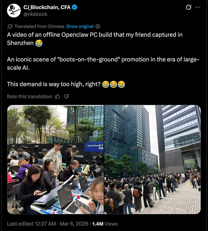 This could explain why AI enthusiasm in China is not limited to large language models and chat interfaces, the form factor that most directly mirrors the print-and-text tradition. In China, AI is showing up in forms that are much more embodied and ambient. At tech exhibitions across the country, AI glasses stands have become some of the busiest spots on the floor, with ordinary consumers lining up to try on devices from Baidu, Alibaba, Xiaomi, and Rokid. These glasses let you pay in shops with a glance at a QR code and a voice command, translate conversations in real time with subtitles rolling across the inner lens, or snap a picture of a product and instantly price it on Taobao. Chinese smart glasses shipments grew over 100% year-on-year in 2025, and the country has rapidly become the fastest-growing market for the devices globally. At the same time, there are viral videos of normal people, not developers, queuing up to install Claude Code on their devices, eager to start building things with agents. The enthusiasm is not for the text; it is for the capability. The interface matters less than the action it enables.