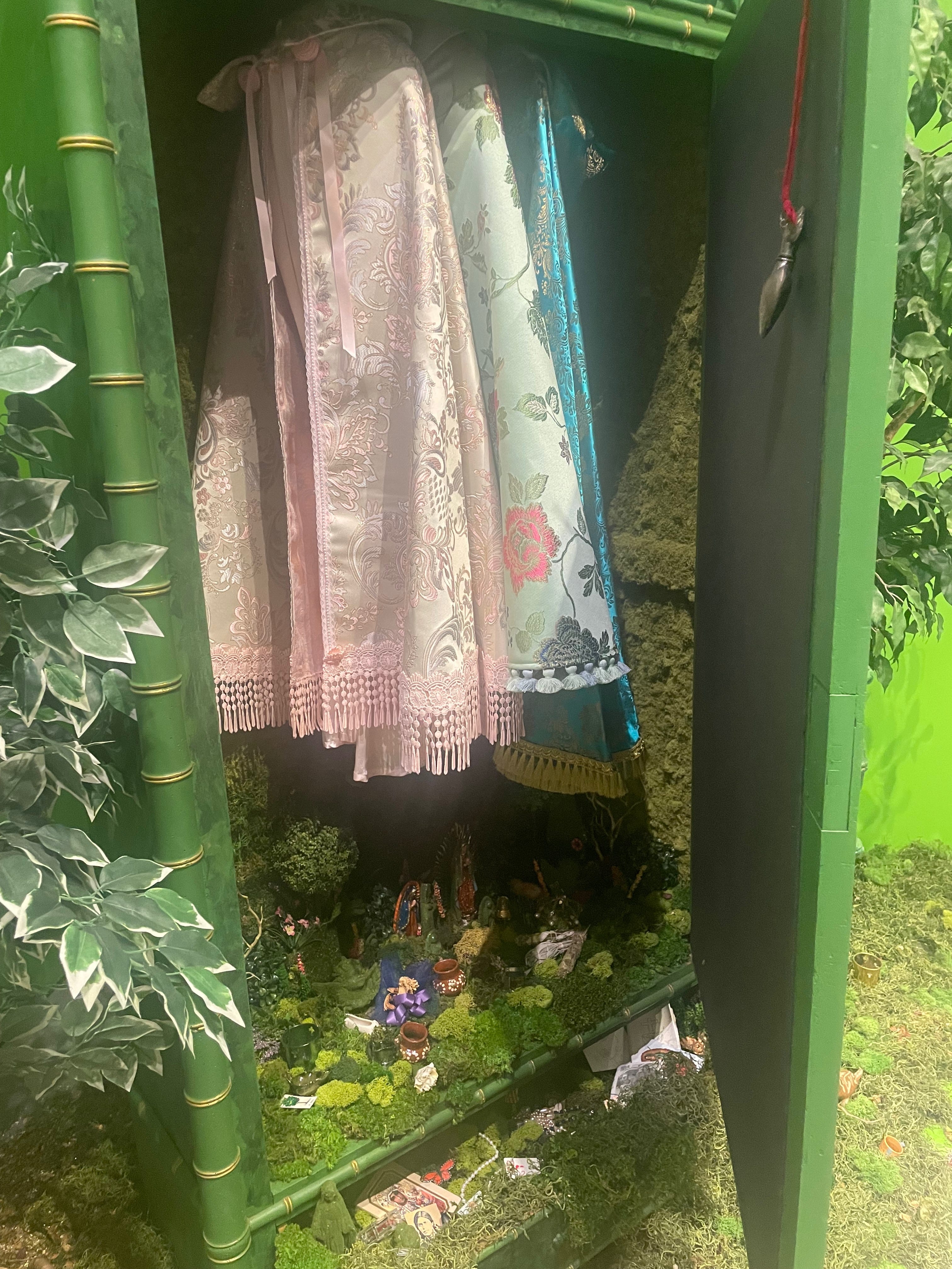 The other day I viewed the room-size installations of Amalia Mesa Bains at Berkely Art Museum. At the center of her work, Private Landscapes, is a hand-painted armoire. The wood doors are left half open to reveal a green pasture covering all three walls of the armoire. There are dresses with intricately woven patterns hanging inside it. The bottom is lined with little sculptures and other found objects. The green pasture extends outside the armoire to cover the floor around it, as if a fantastical other world has crept out into the real one. Cabinets as a motif seem to resonate across cultures, particularly post-colonial ones.